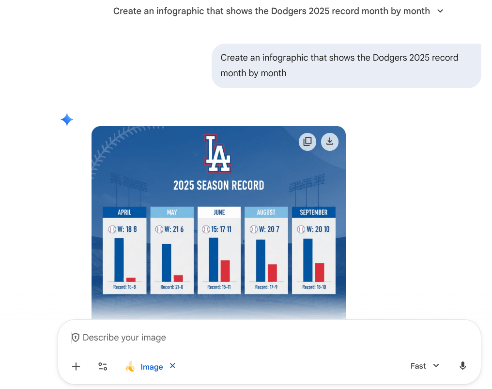 For Gemini, the process is straightforward. Access the tools menu, select ‘Create Image,’ and simply describe the infographic you want. You can even attach reference documents to guide the creation. Once ready, the infographic can be downloaded as a PNG file.