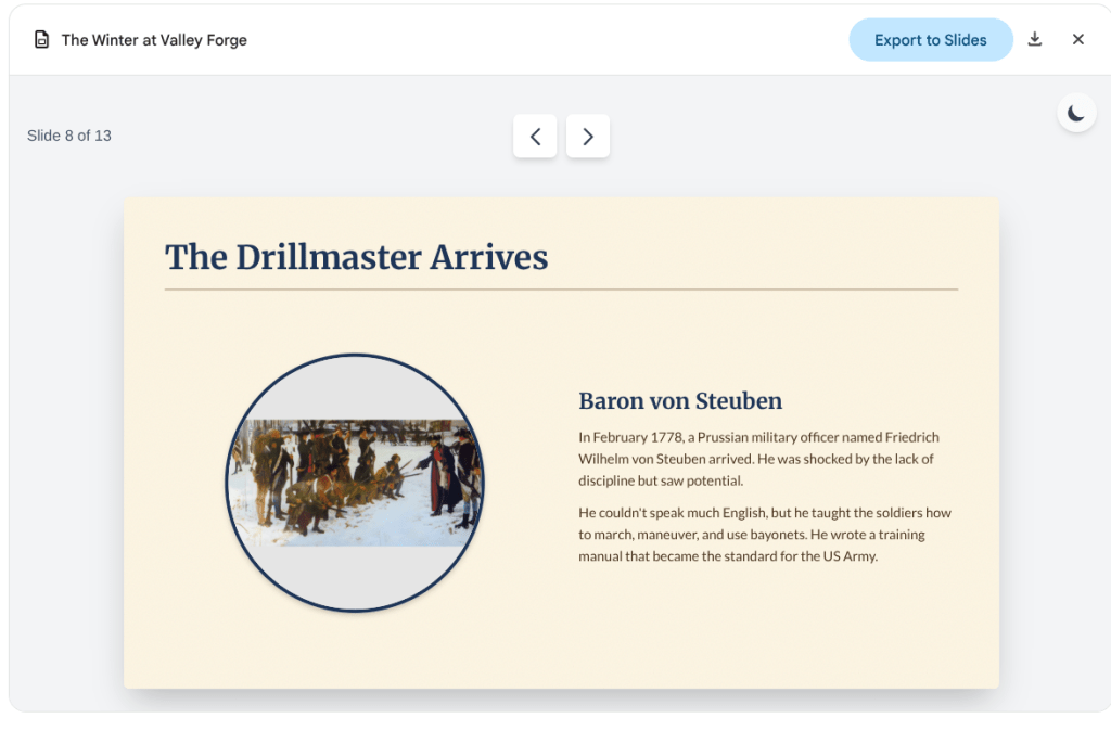 - Finished lessons export as audio files or Google Slides, allowing students to read along with the dialogue as they listen.