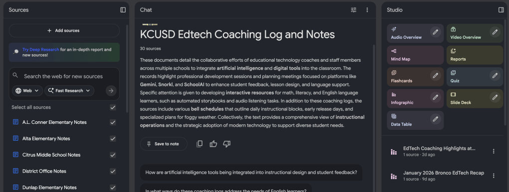 The real efficiency begins before you even step foot on a school campus. Prior to a site visit, you can ask NotebookLM to generate a summary recap of the most recent coaching or PD interactions for that specific location. In seconds, the tool can provide a concise overview of the support provided to individual teachers, grade levels, or departments. By specifically asking the tool to include prep periods and room numbers in this summary, you receive a complete “cheat sheet” for your day. This eliminates the need to manually sift through pages of data to remember where you left off with a particular educator.