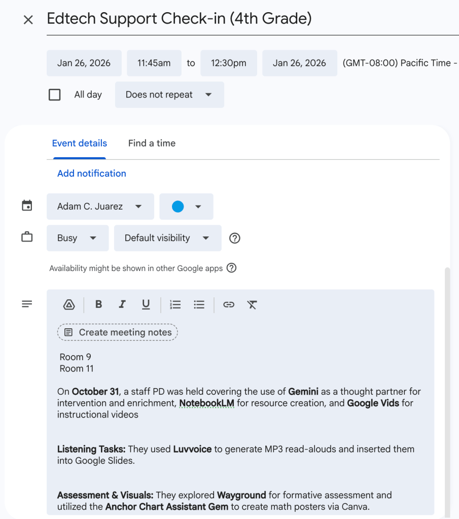This blog post was drafted with the help of Google Gemini to help organize and flesh out my thoughts and ideas regarding how to use NotebookLM and Google Calendar to manage instructional coaching notes and scheduling of coaching sessions. I also used NotebookLM to generate a brief audio overview, perfect for those who want to listen and learn on the go.