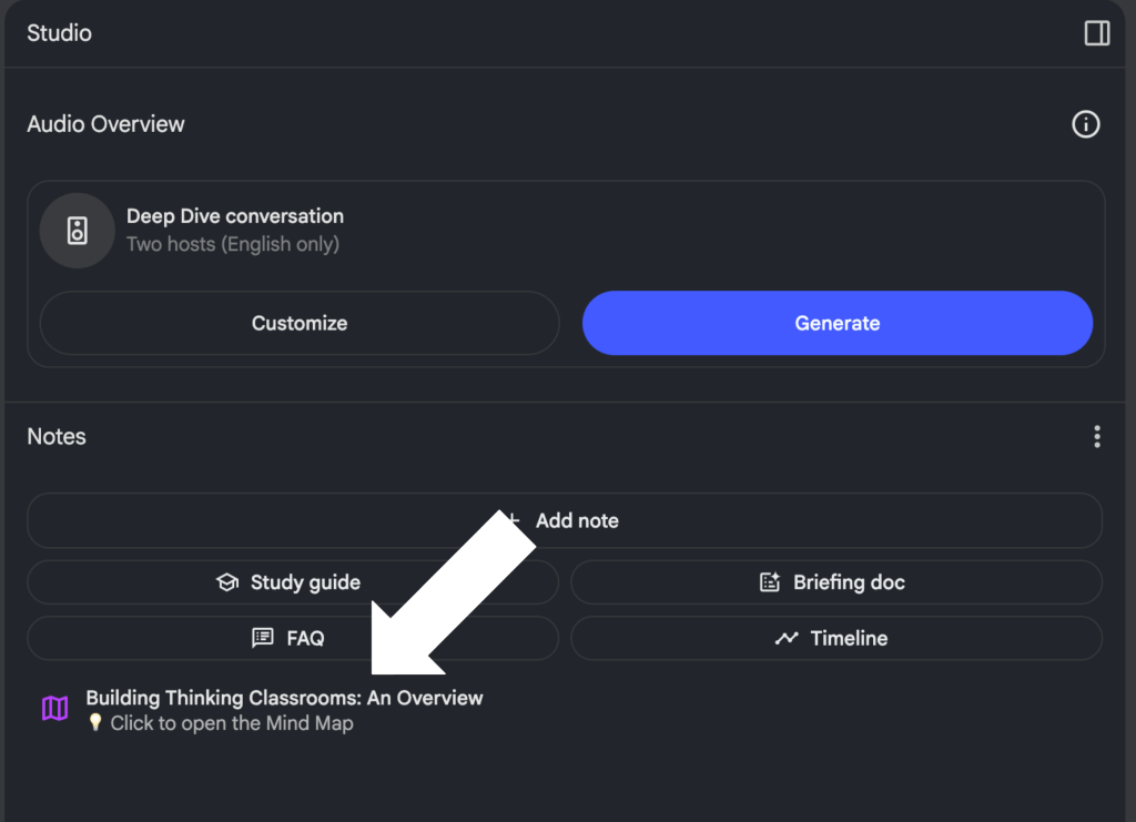- In under a minute, a button will appear in the Studio column. Click it—and your Mind Map is ready. With your Mind Map Open, click the little arrows to expand the view to see sub-points.
