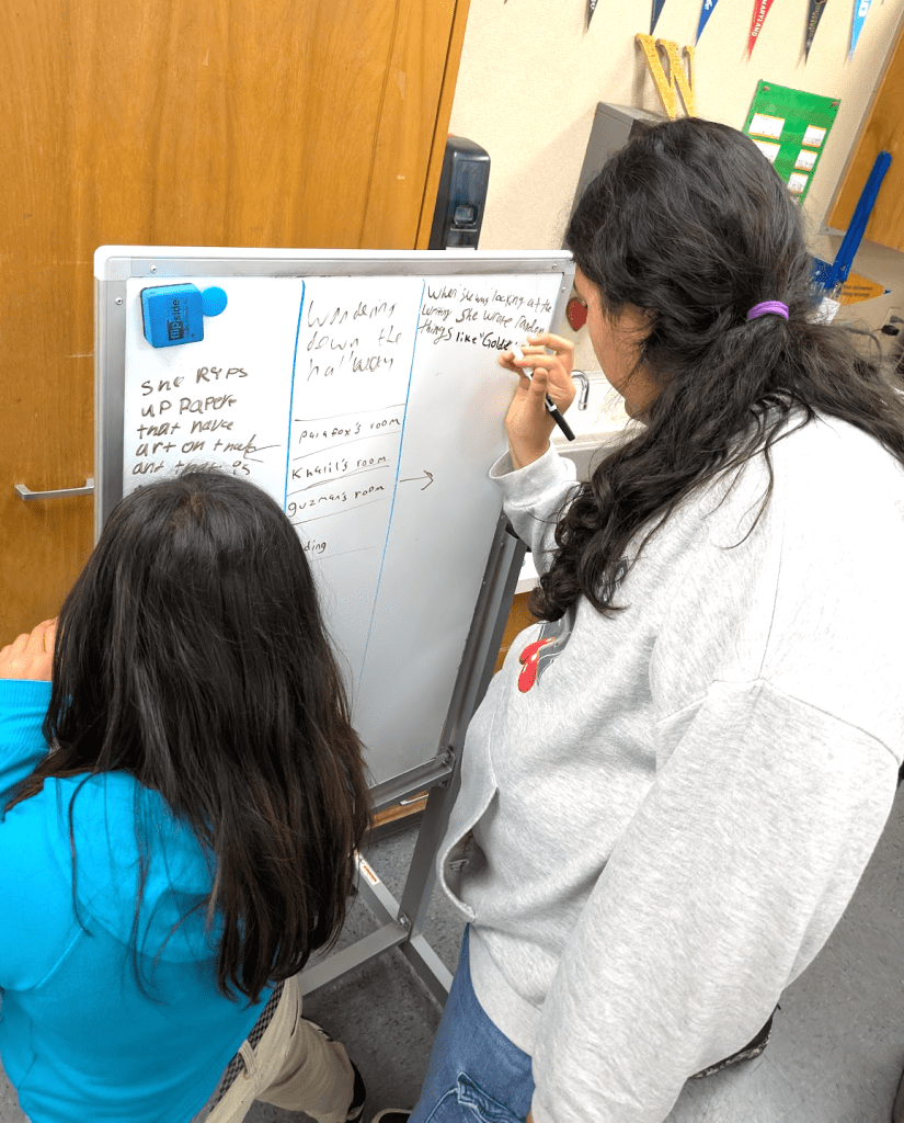 One 5th grade class in Dinuba, CA took this lesson to the next level with a creative, no-tech twist. Using a local retelling of The Three Little Pigs, students mapped out the story’s events on whiteboards, plotting them vertically to show the main narrative arc. In the margins, they marked key “forks in the road”—moments where a character’s choice or a shift in circumstance could send the story in a completely different direction.