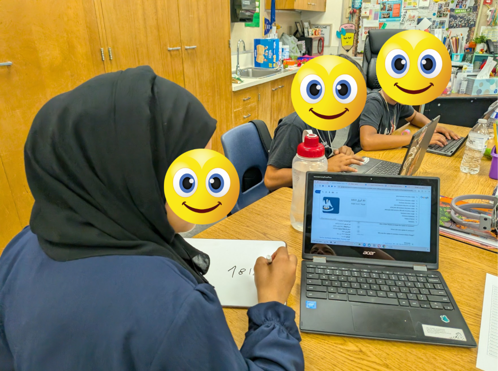 From there, she opened a new tab in Chrome, which was set up to display both English and Arabic. She typed the research topics from her whiteboard into the search bar, navigated to age-appropriate sources, and found the answers she needed, all while navigating two languages. As she engaged in her research, she wrote the answers back on her whiteboard and then carefully transposed them into the corresponding slides on her Canva slide deck.