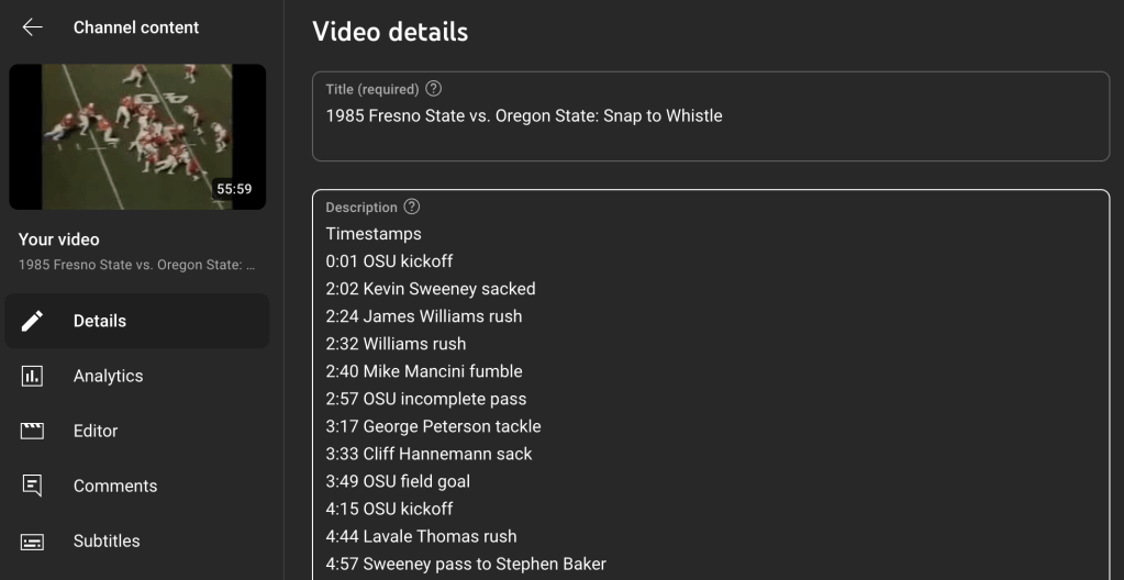 This connection became clear to me through a personal hobby. As a rabid fan of the Fresno State Bulldogs, I started a new series on my YouTube channel called “Snap to Whistle.” In it, I break down full game videos. Using iMovie, I “chop” the footage into smaller clips that only show the action from the snap to the whistle on each play. All the time between plays gets deleted. This process condenses a three hour broadcast into about an hour of pure football. To make it easier to navigate, I also add a timestamp for every single play, along with a short description, right in the YouTube video description.