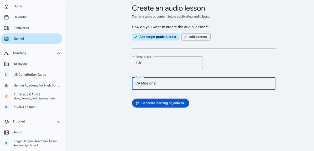 To get started, navigate to your Google Classroom dashboard and select the Gemini tab located on the left side of the screen. From there, click the button labeled Create Audio Lesson. The tool offers flexibility in how you build your content; you can simply input a specific grade level and topic, or you can copy and paste custom text that you want the lesson to focus on.