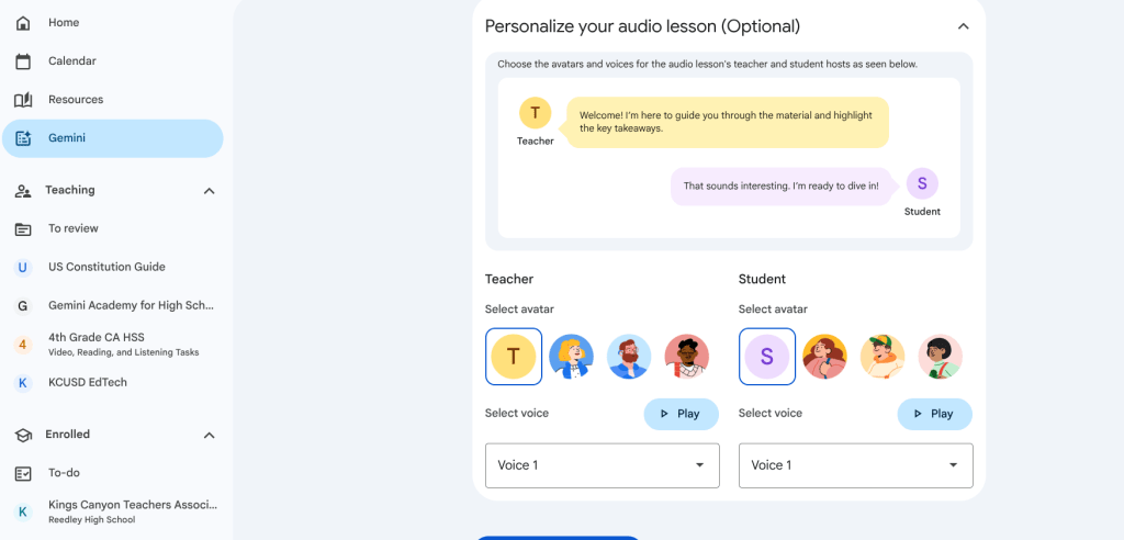 Once you provide your source material or grade level with topic, Gemini generates a set of editable learning objectives. This step ensures that the final product aligns perfectly with your instructional goals. You also have the creative freedom to customize the voices and avatars used in the lesson, allowing you to tailor the experience to suit your classroom’s personality. After you are satisfied with the objectives and settings, you can generate the lesson.