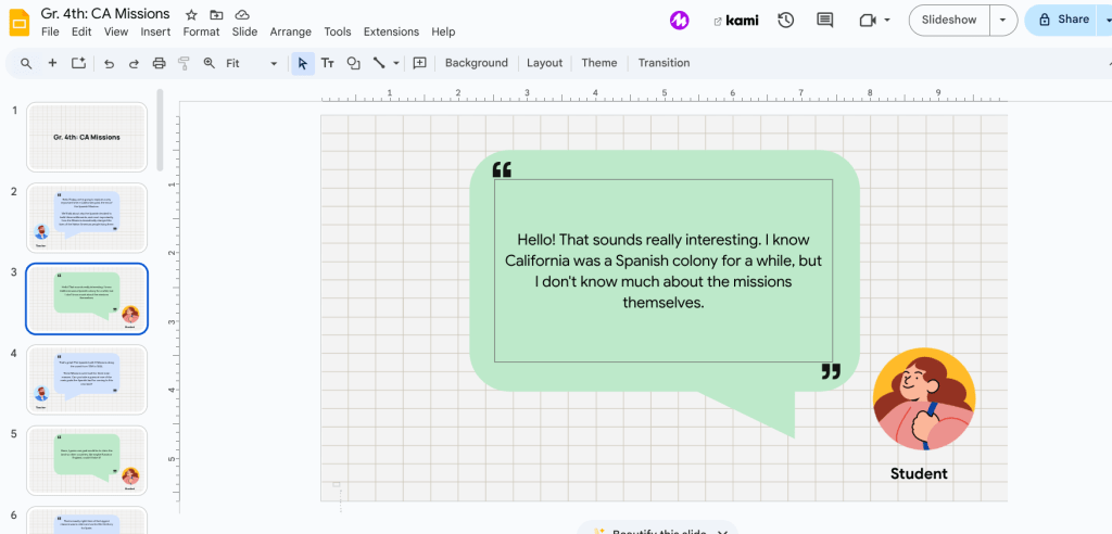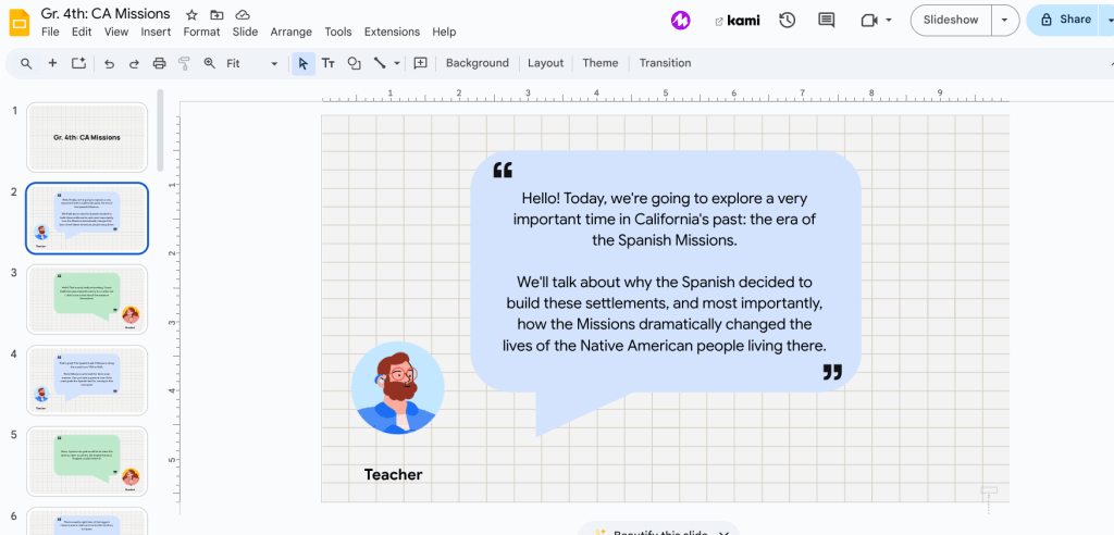 Sharing the lesson with your students is straightforward thanks to versatile export options. You can save the audio as an .opus file directly to your Google Drive, or you can export the lesson as a Google Slides presentation. Choosing the Slides option is particularly helpful for supporting literacy and comprehension, as the tool places each line of dialogue on its own slide alongside the speaker’s avatar. This allows students to follow along visually while they listen to the audio.