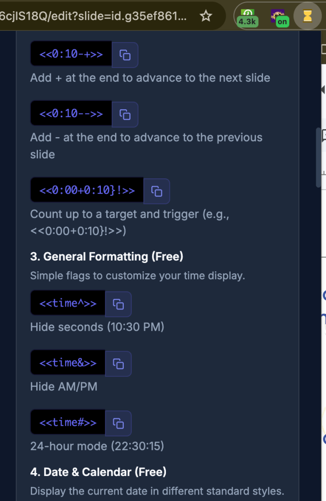 Once you have installed the extension from the Chrome Web Store, it operates through simple text commands. You do not need to navigate complex menus or embed external code. Instead, you simply create a text box on any slide where you want a timer to appear. By typing specific symbols and numbers into that text box, the extension transforms your text into a live, functioning timer once you enter present mode.