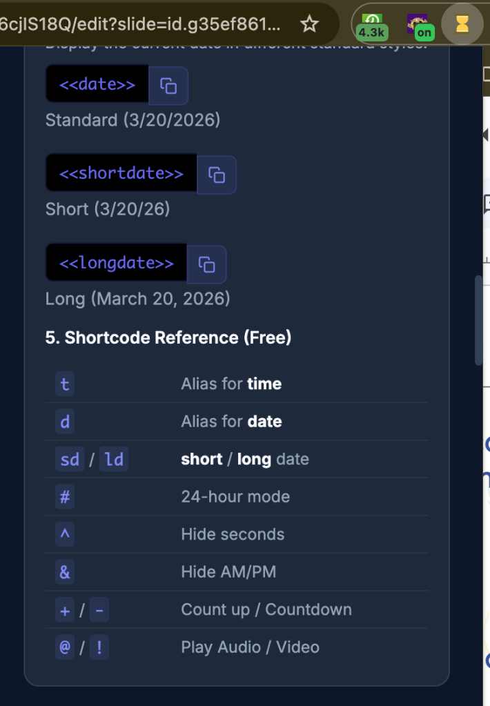 - Easy Setup: Uses simple text commands to embed timers directly onto slides.